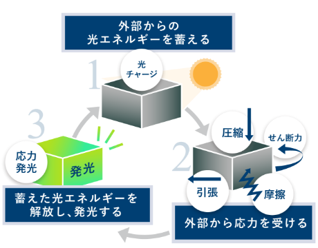 応力発光材料とは、外部からの応力を受けることで発光する、無機の機能材料です。